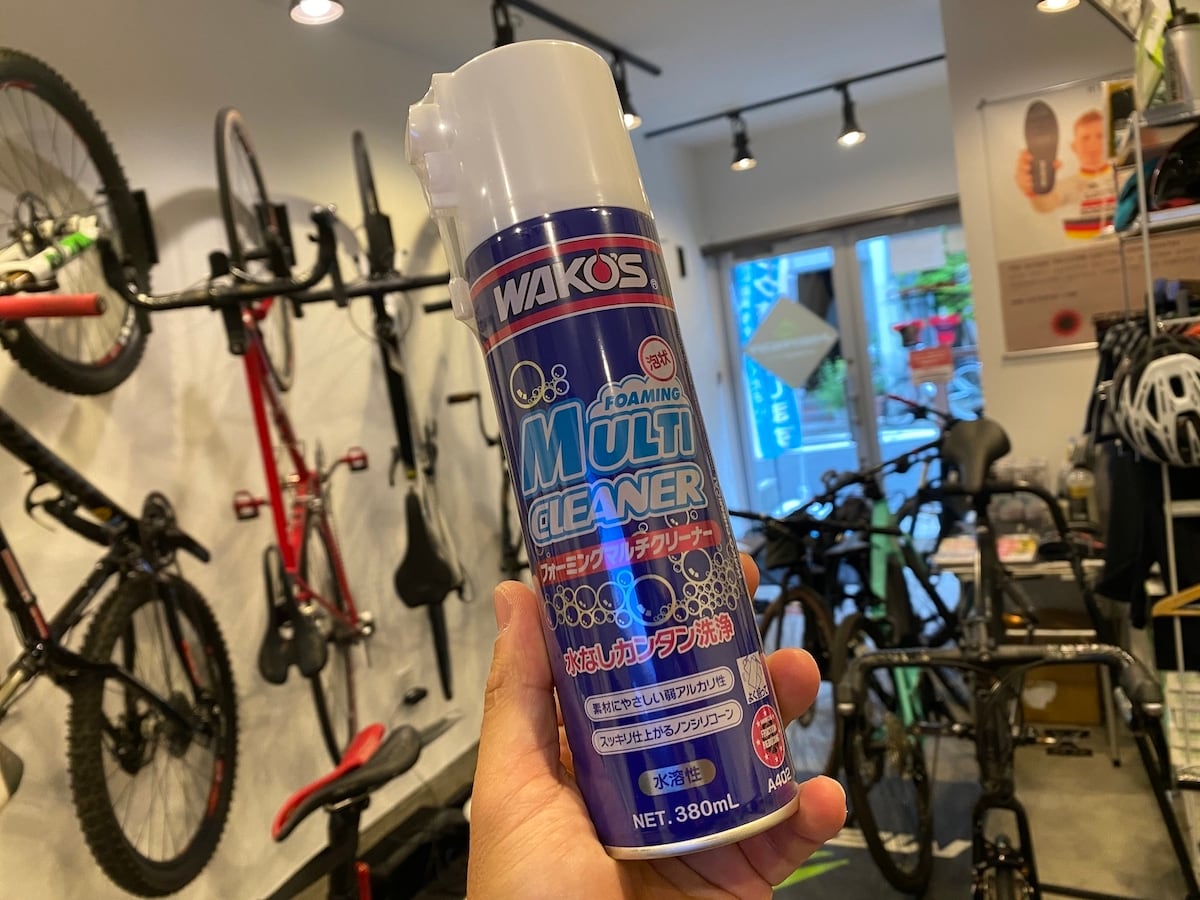 チェーン周りが終わったら、「フォーミングマルチクリーナー」を使って洗浄、汚れをふき取っていきます。